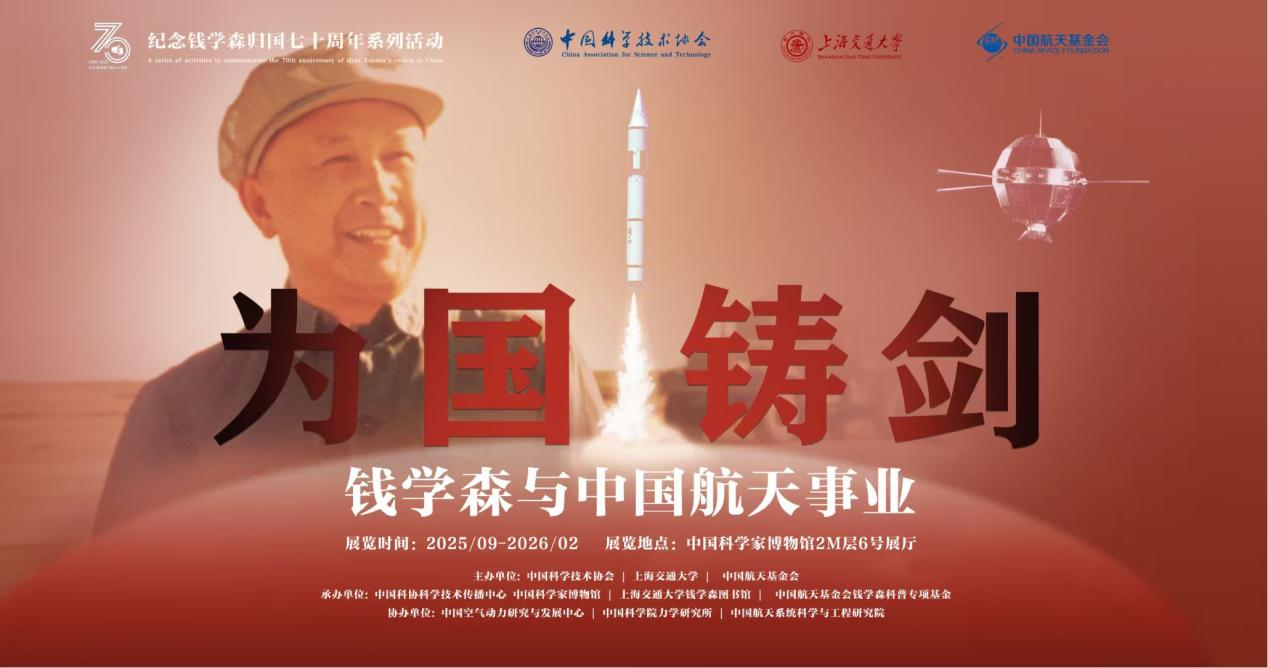 ?1949年中华人民共和国成立之后,党中央高瞻远瞩、审时度势,做出发展以“两弹一星”为核心的国防尖端科学技术的决策。1955年,钱学森满怀爱国热情,冲破藩篱,毅然归国,投身火箭、导弹、人造地球卫星等尖端技术的研制工作。2025年是钱学森同志归国七十周年。为进一步学习贯彻习近平总书记关于大力弘扬科学家精神的重要指示,讲好钱学森故事,回应公众对高质量科普日益增长的需求,中国科学技术协会、上海交通大学、中国航天基金会共同策划《为国铸剑:钱学森与中国航天事业》专题展览。